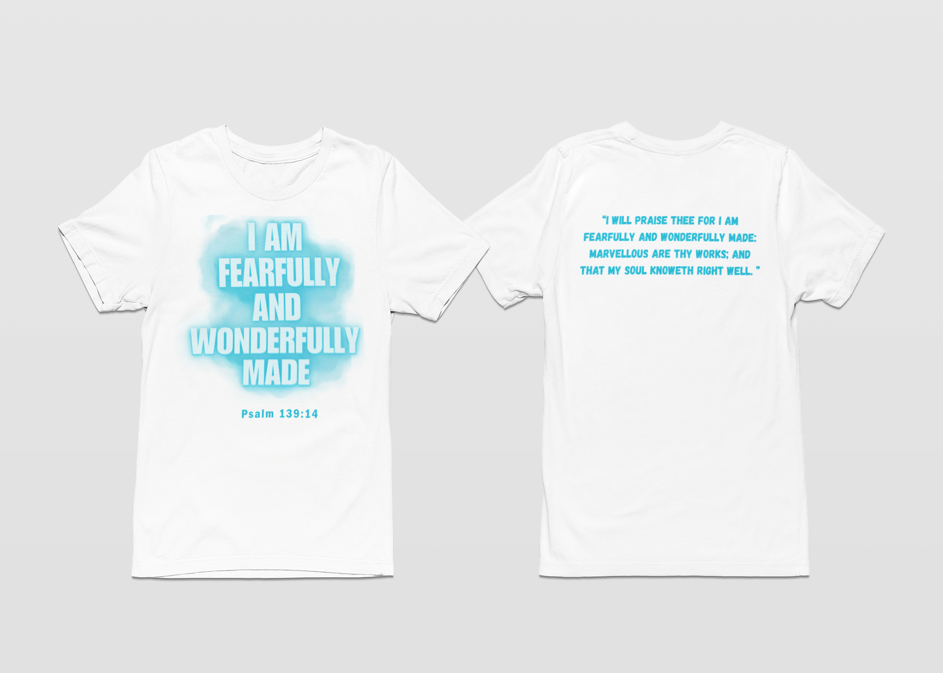 I will Praise THEE for I AM FEARFULLY AND WONDERFULLY MADE as Psalm 139:14 tells us. God has designed us wonderfully in his image. Let the words on t-shirt minister to you!